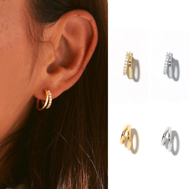 Sierlijke unieke twee-in-één gouden Huggie-hoepeloorbellen. Veelzijdige gouden oorringen. Mix en match oorringen.