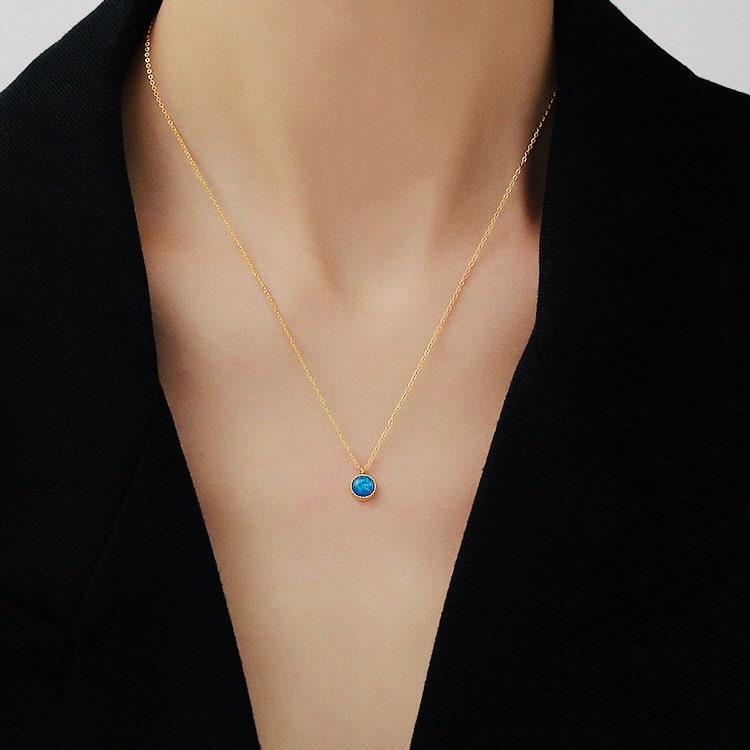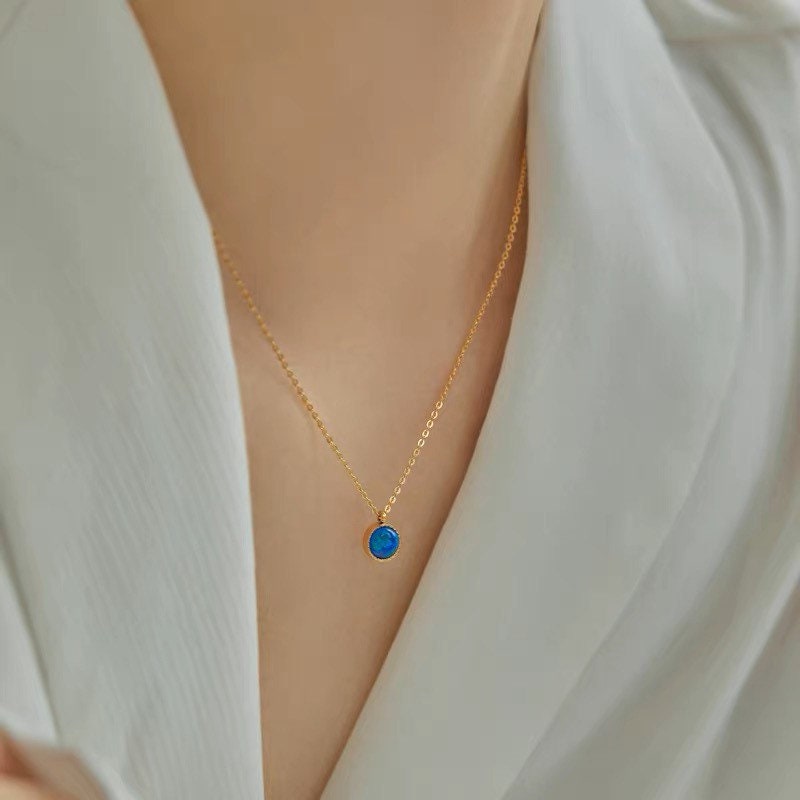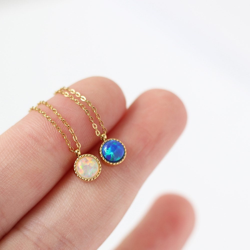 Fijne kleine opaal bedelketting, sierlijke ronde geslepen opaal hanger, verkrijgbaar in witte en blauwe kleur. Perfect cadeau voor vrienden. Sprankelende blauwe bedelketting, gemakkelijk te combineren met andere gelaagde kettingen en past goed bij elke outfit.