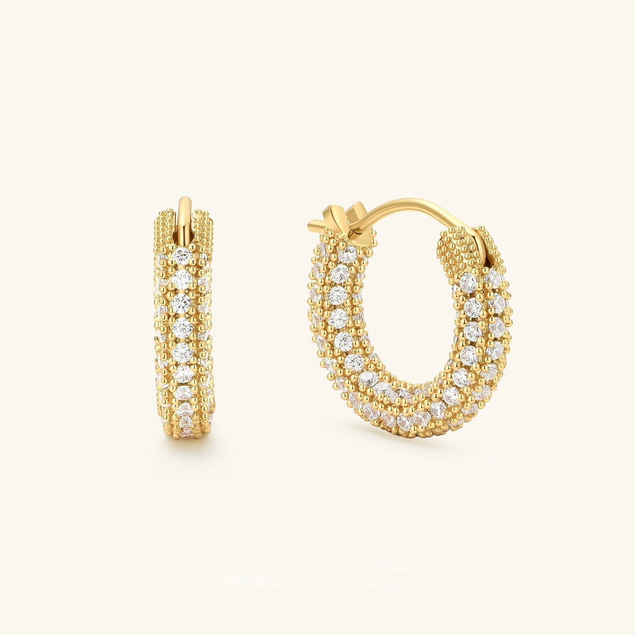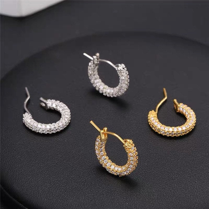 These pave huggies earrings are handcrafted with high-quality cubic zirconia stones, set on a durable, lightweight base. To maintain their sparkle, simply clean with a soft, dry cloth and avoid harsh chemicals or abrasive surfaces.
