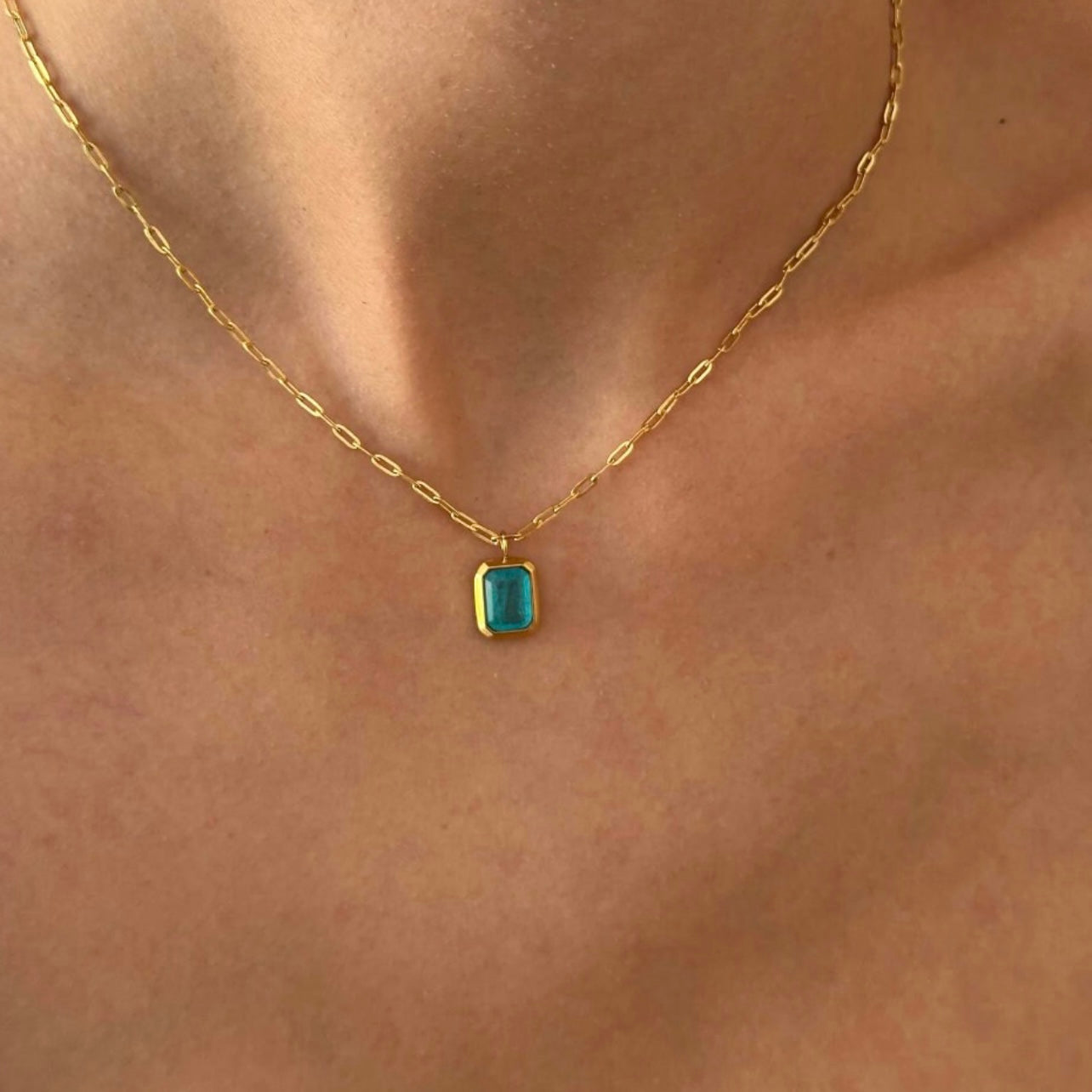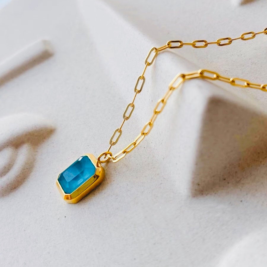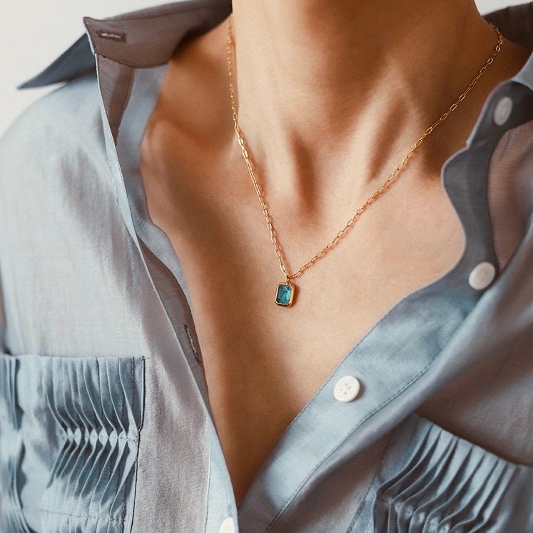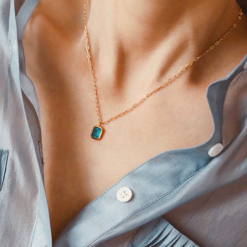 Discover elegance with our Emerald and Blue Pendant Necklace. This versatile piece, perfect as an everyday necklace, features a stunning emerald pendant and vibrant blue pendant on the other, nestled within a dainty gold chain.