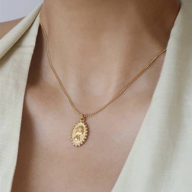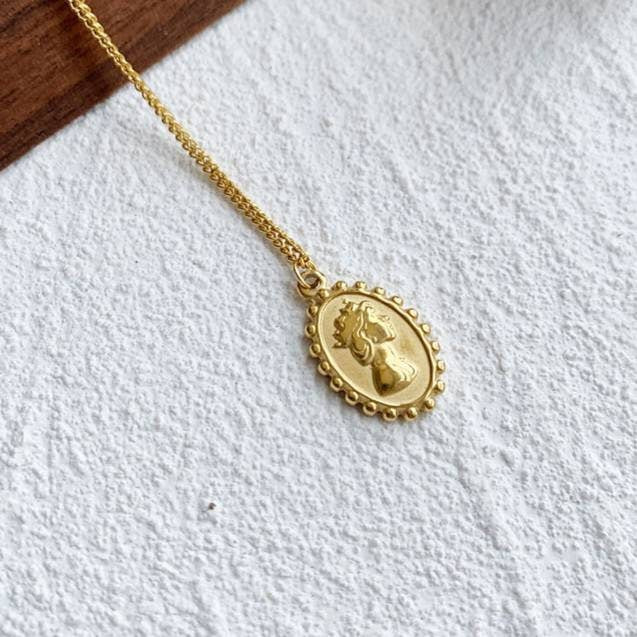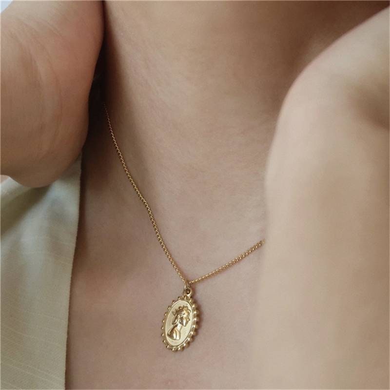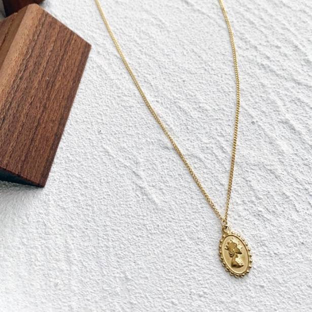 Make a royal statement with this Queen pendant necklace. The dainty oval gold coin pendant adds a minimalist touch to your outfit and is perfect for everyday wear. This stylish necklace also makes a great gift for her.