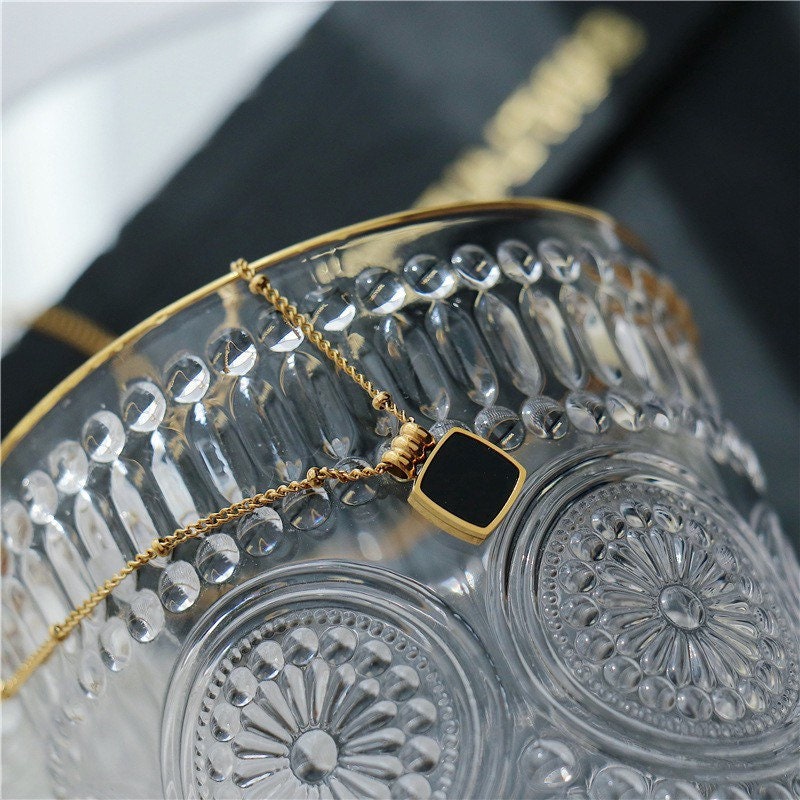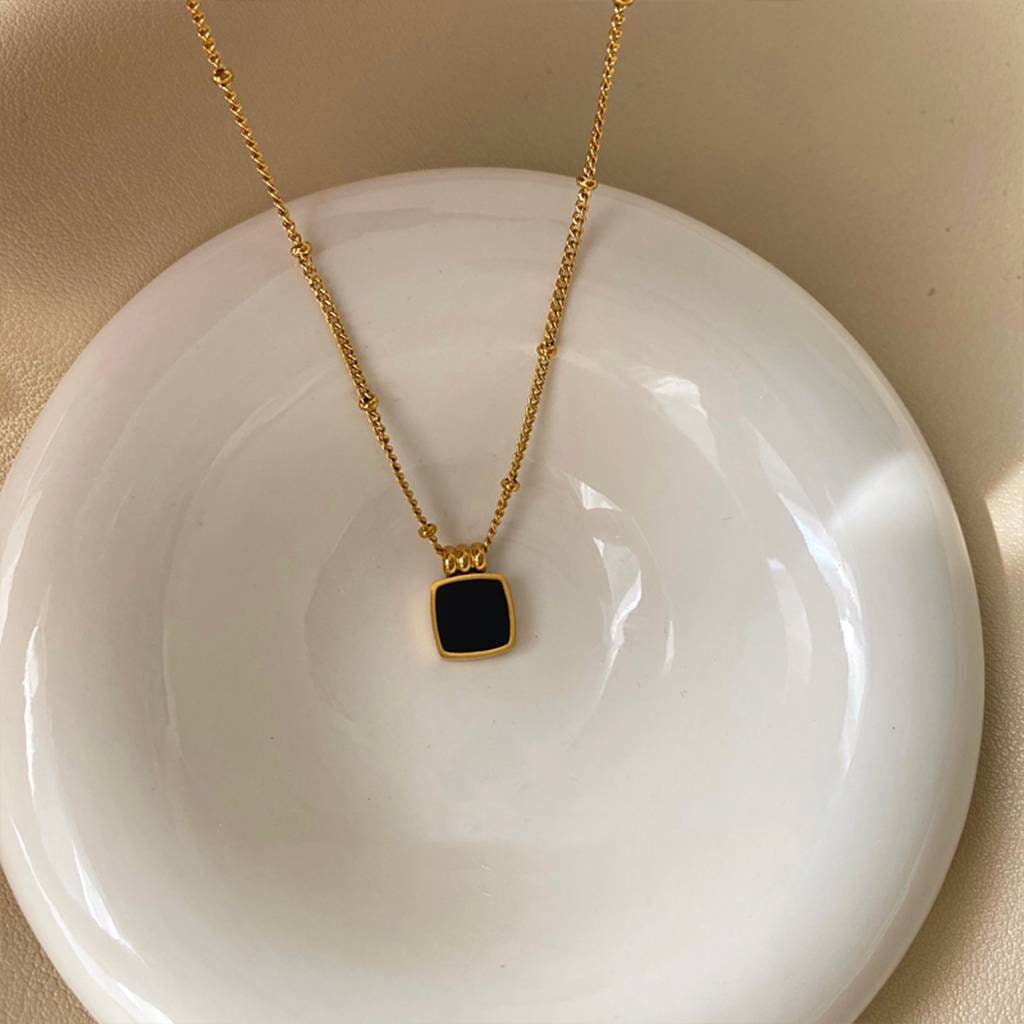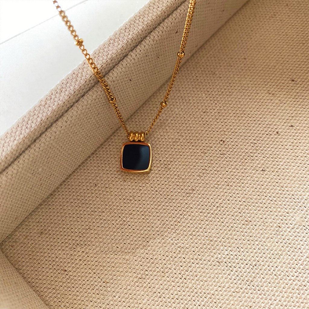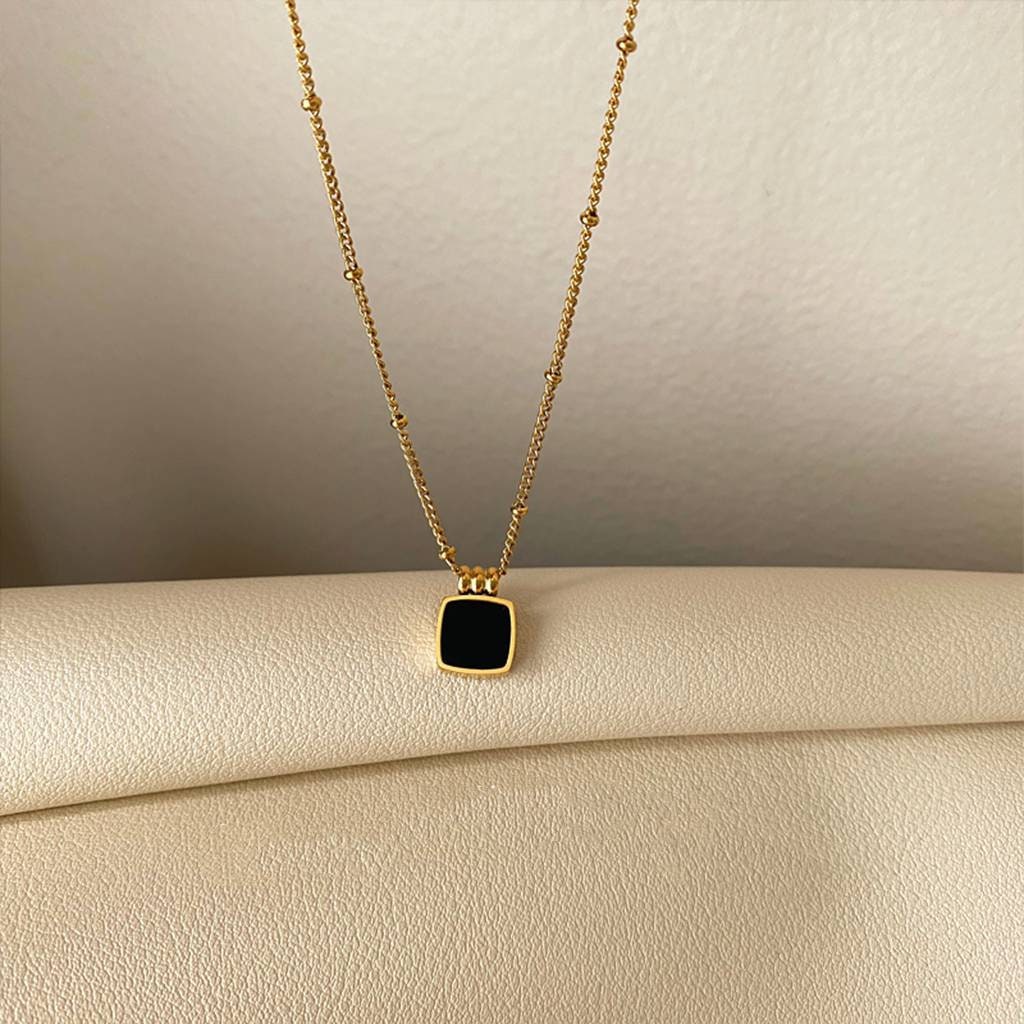 The Square Black Charm Necklace is a sophisticated and elegant piece that is perfect for any occasion. Made with genuine onyx stone and accented with a chic black and gold pendant, this necklace is a must-have for any jewelry collection. Gift it to her or treat yourself to this timeless treasure.
