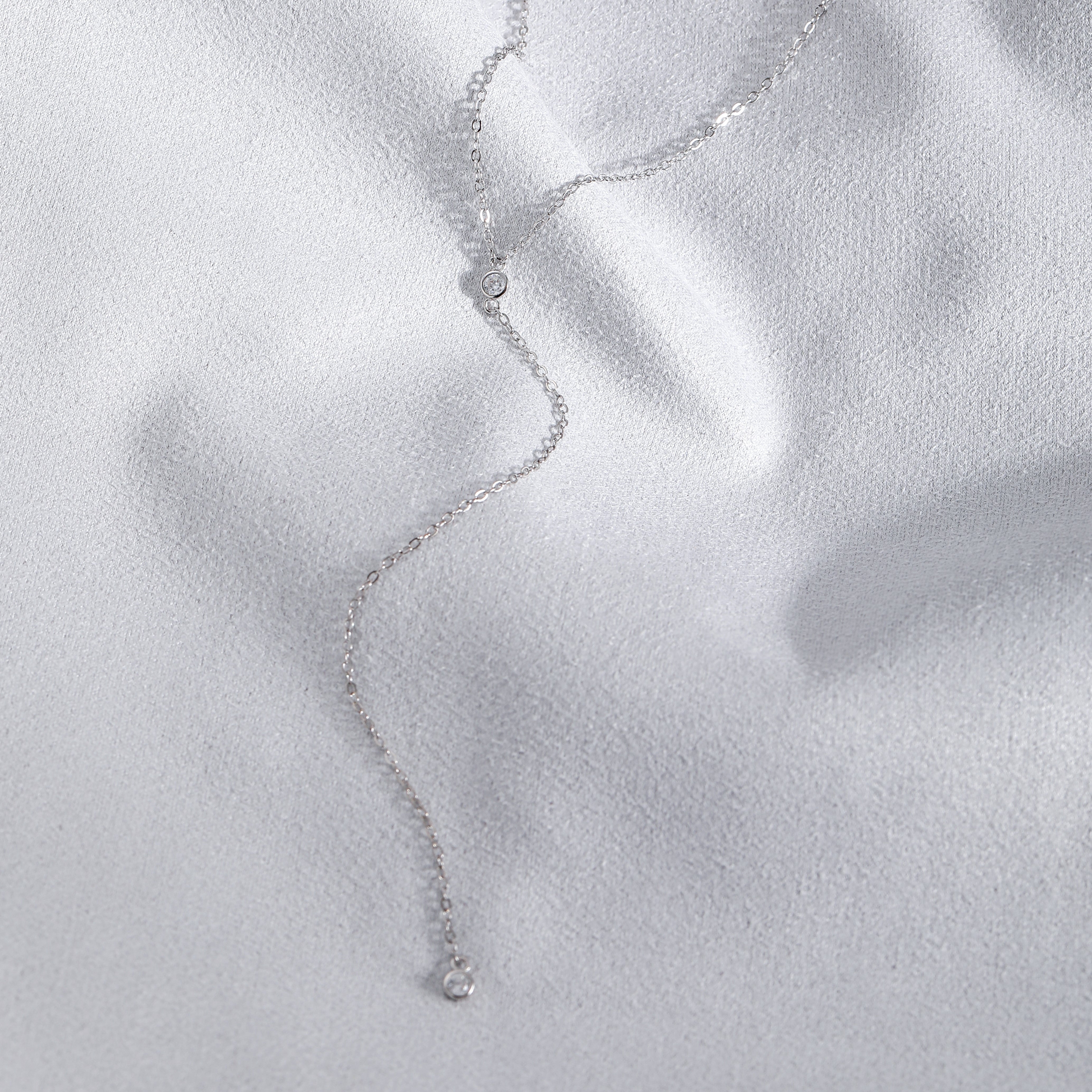 Carefully crafted with a delicate chain Y, this White Gold Love Lariat Y Chain necklace is the perfect accessory for any outfit. The unique love lariat design adds a touch of elegance and versatility to this double necklace, making it a must-have for any jewelry collection. Elevate your style with this timeless and sophisticated piece. Fancy a gold version, check out our Love Gold Lariat Necklace